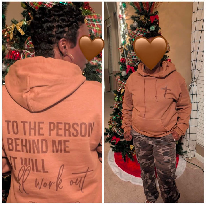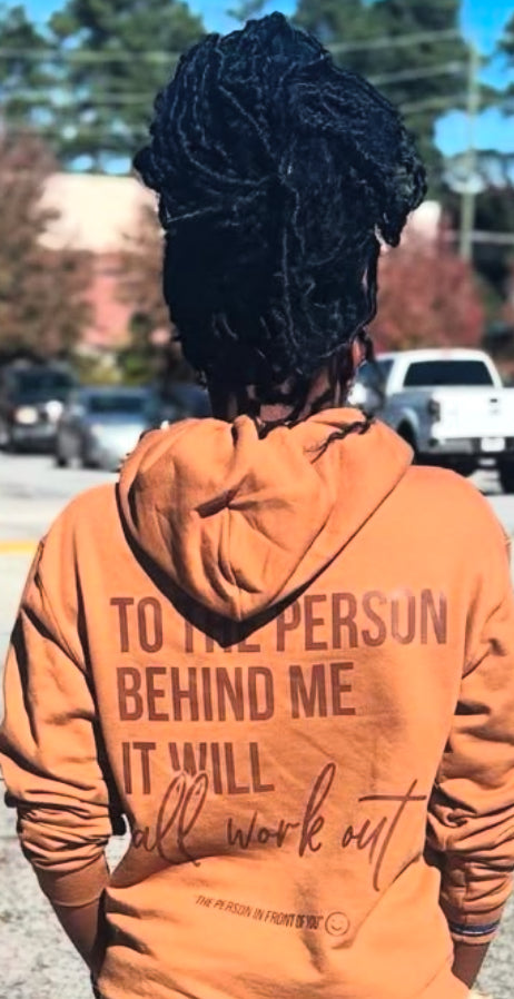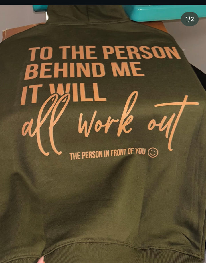 "To the person behind me, it will all work out" This hoodie serves as a constant reminder to keep moving forward and believing in yourself. Made with soft fabric, it provides both comfort and inspiration. This hoodie will bring a sense of comfort and positivity to whoever wears it.